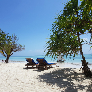 Zwei einsame LIegen am Strand von Mauritius